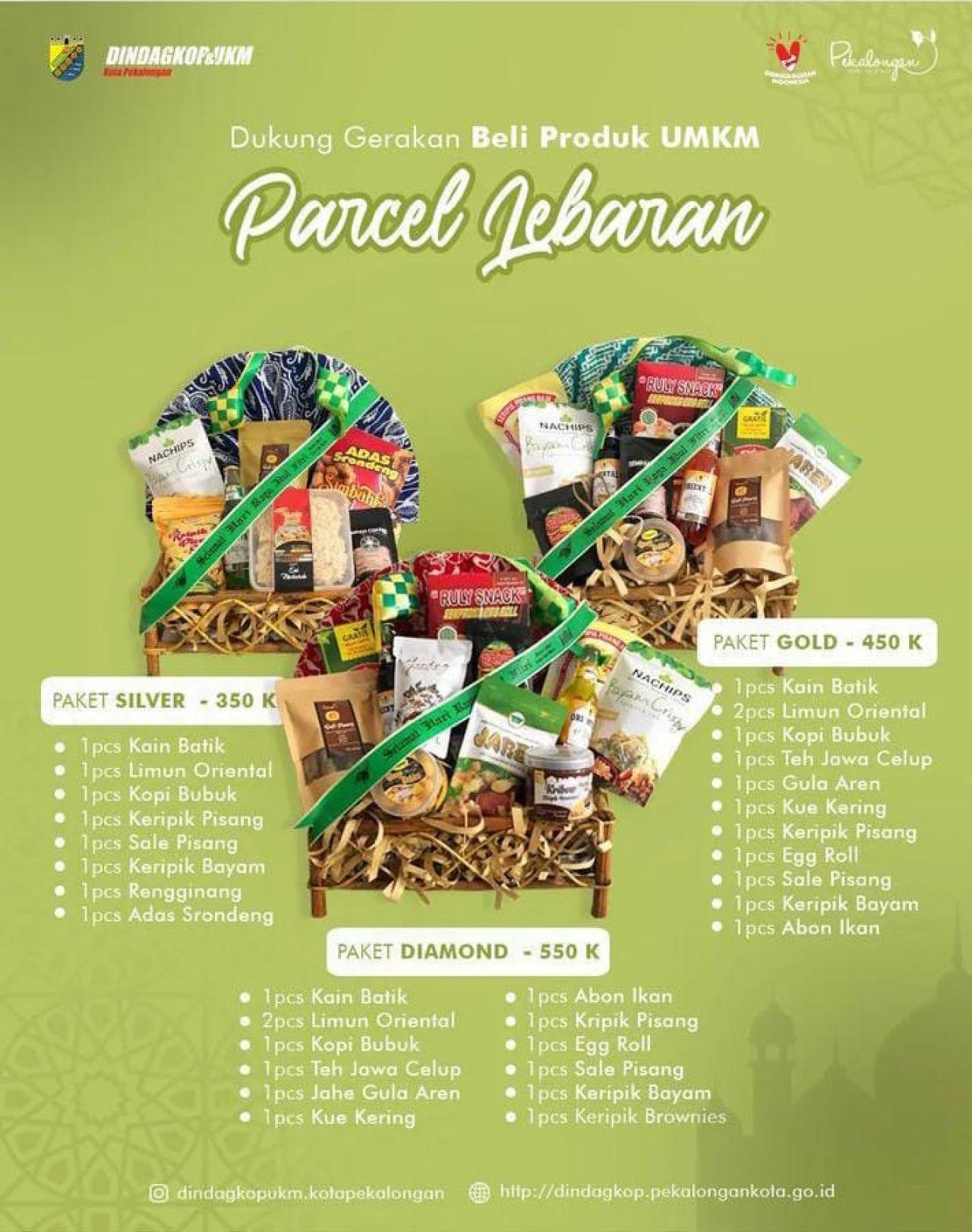 RILISJATENG.COM– Sebagai upaya untuk mengenalkan produk dan mendongkrak omset penjualan UKM binaannya jelang Hari Raya Idul Fitri 2023, Pemerintah Kota Pekalongan melalui Dinas Perdagangan, Koperasi (Dindagkop) dan UKM setempat mulai membuka pemesanan parcel lebaran sejak 3-14 April 2023 yang terdiri dari 3 pilihan paket diantaranya paket Silver senilai 350 ribu rupiah, paket Gold senilai 450 ribu rupiah dan paket Diamond senilai 550 ribu rupiah.