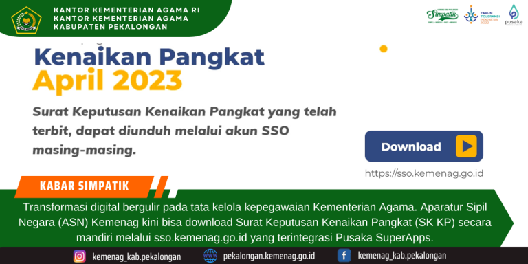 “Alhamdulillaah, kini Biro Kepegawaian Kemenag sudah meluncurkan program download Surat Keputusan atau SK Kenaikan Pangkat secara digital,” terang Kepala Biro Kepegawaian Setjen Kemenag, Nurudin, di Jakarta, Ahad (2/4/2023).
